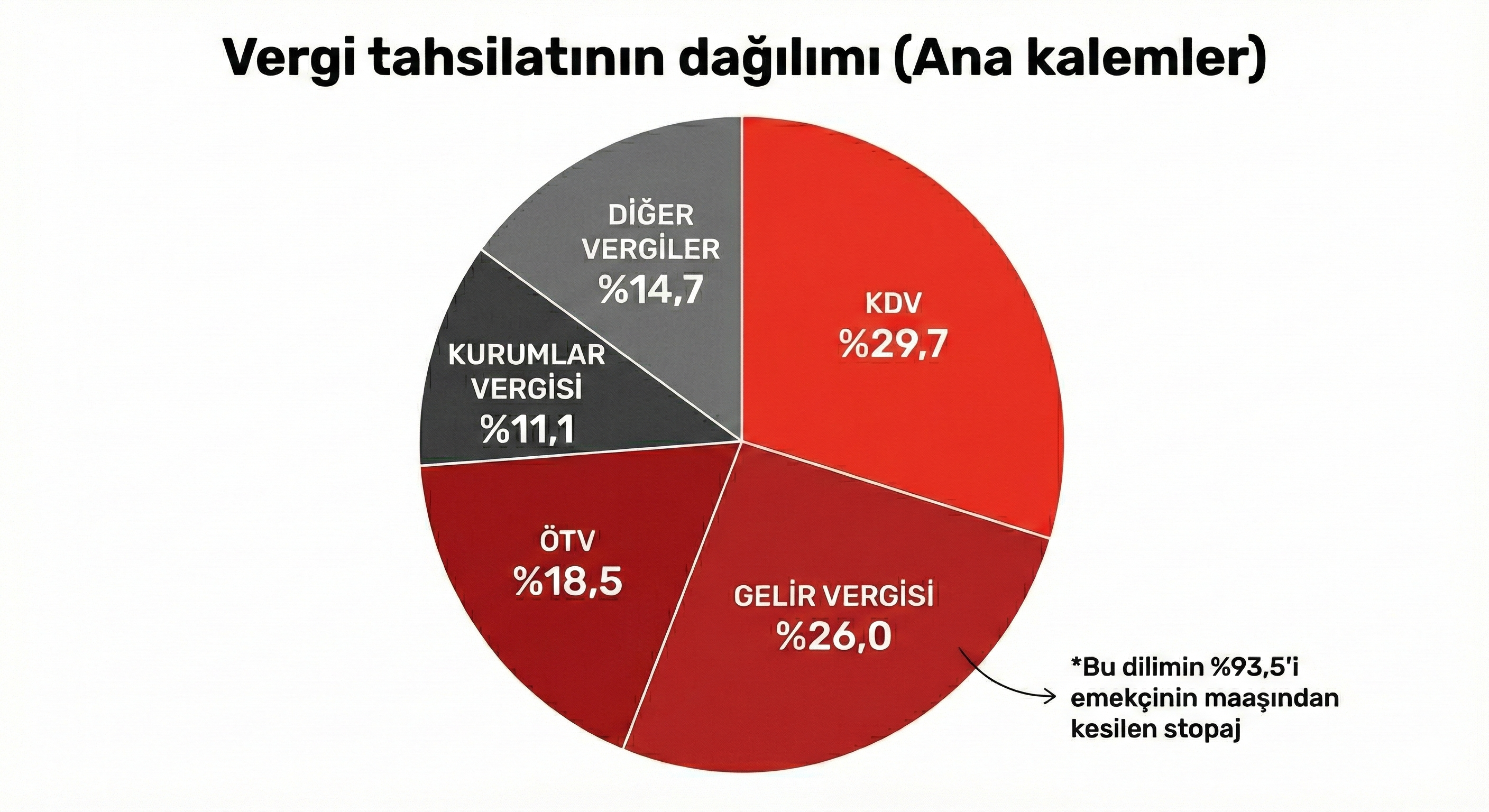 Ancak bu rakamın yüzde 93,5’i, yani 2,6 trilyon lirası stopaj yoluyla toplandı. Bu kalem, doğrudan doğruya işçinin, emekçinin ve kamu çalışanın maaşı daha cebine girmeden kaynağında kesilen vergileri ifade ediyor.